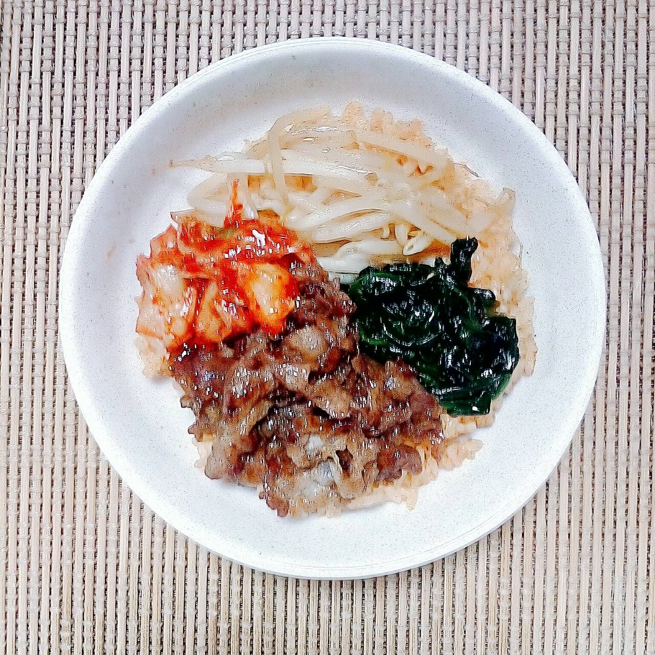 - ご飯が炊き上がったら肉、野菜、キムチをトッピングして出来上がり。