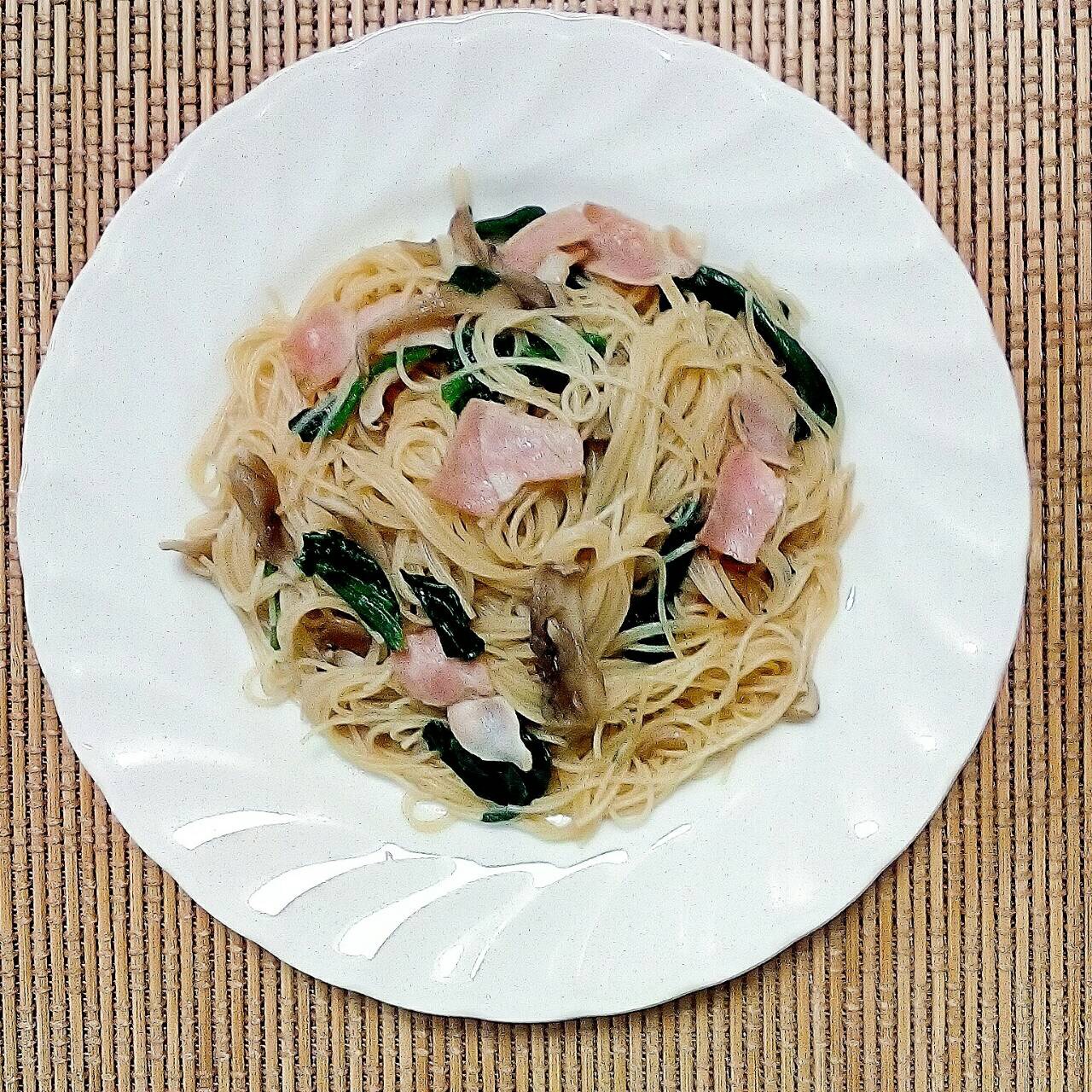 mitsukoです。ほうれん草とベーコン、といえばパスタですが、ビーフンで作っても細い麺に具が絡んでおいしいですよ。