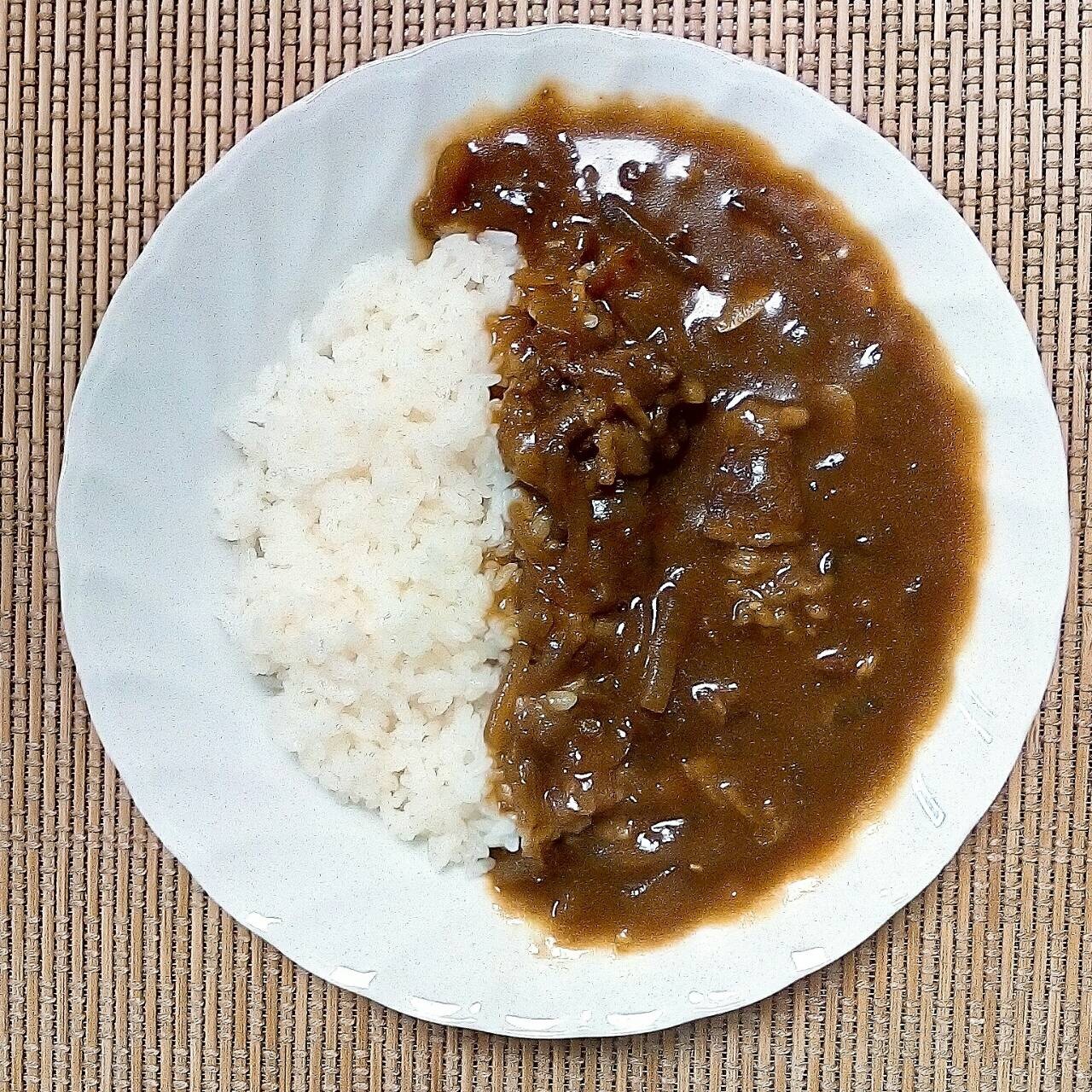 関西ではほとんどがカレーには牛肉が主流です。高価な牛肉🐂ですが、意外と安く売られている味付け肉をタレがついたまま使ったカレーです。