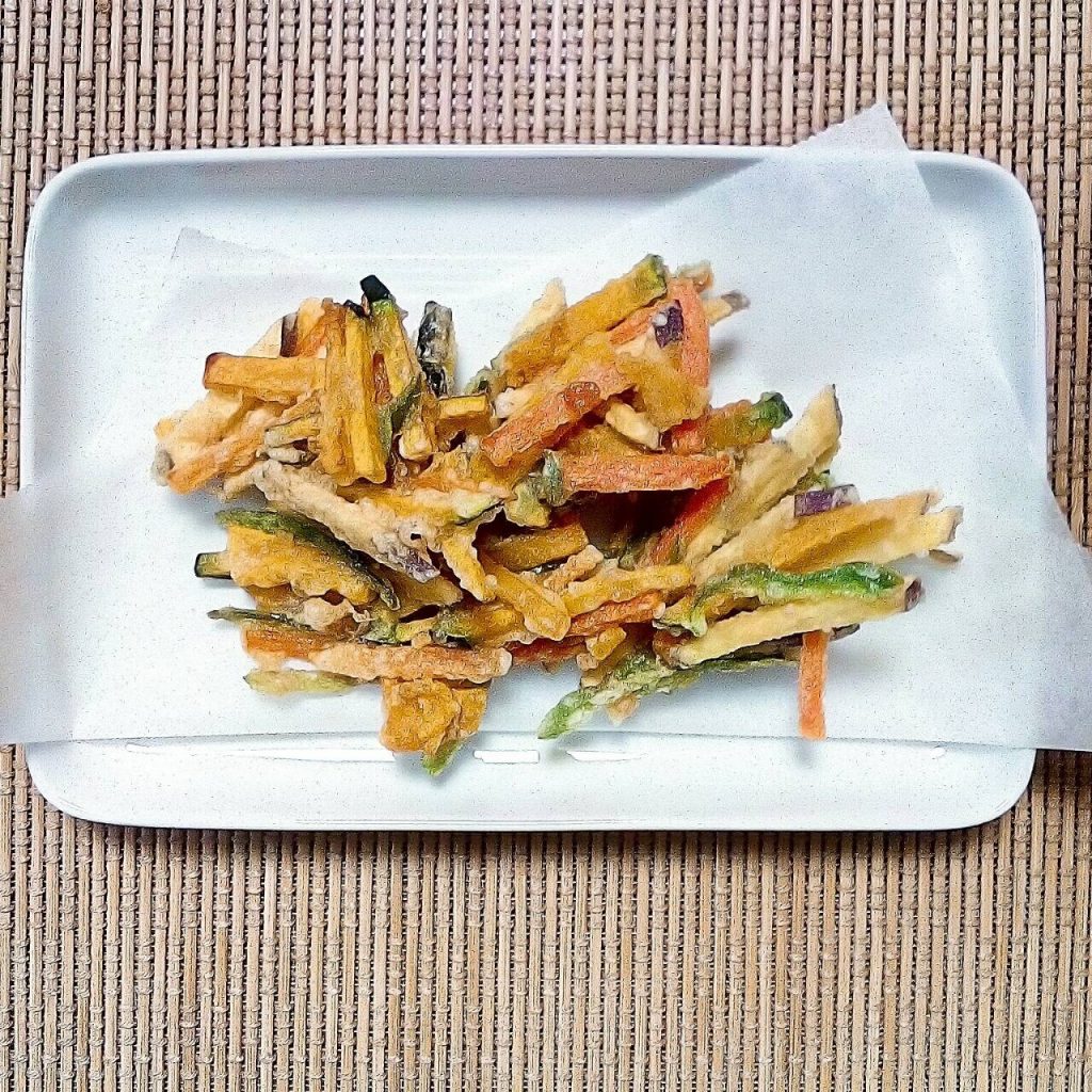 - 天ぷら鍋に油を170~180度に温めたら大きめのスプーンを油にくぐらせてボウルの野菜をすくって鍋はだからゆっくりと油の中に入れて揚げます。