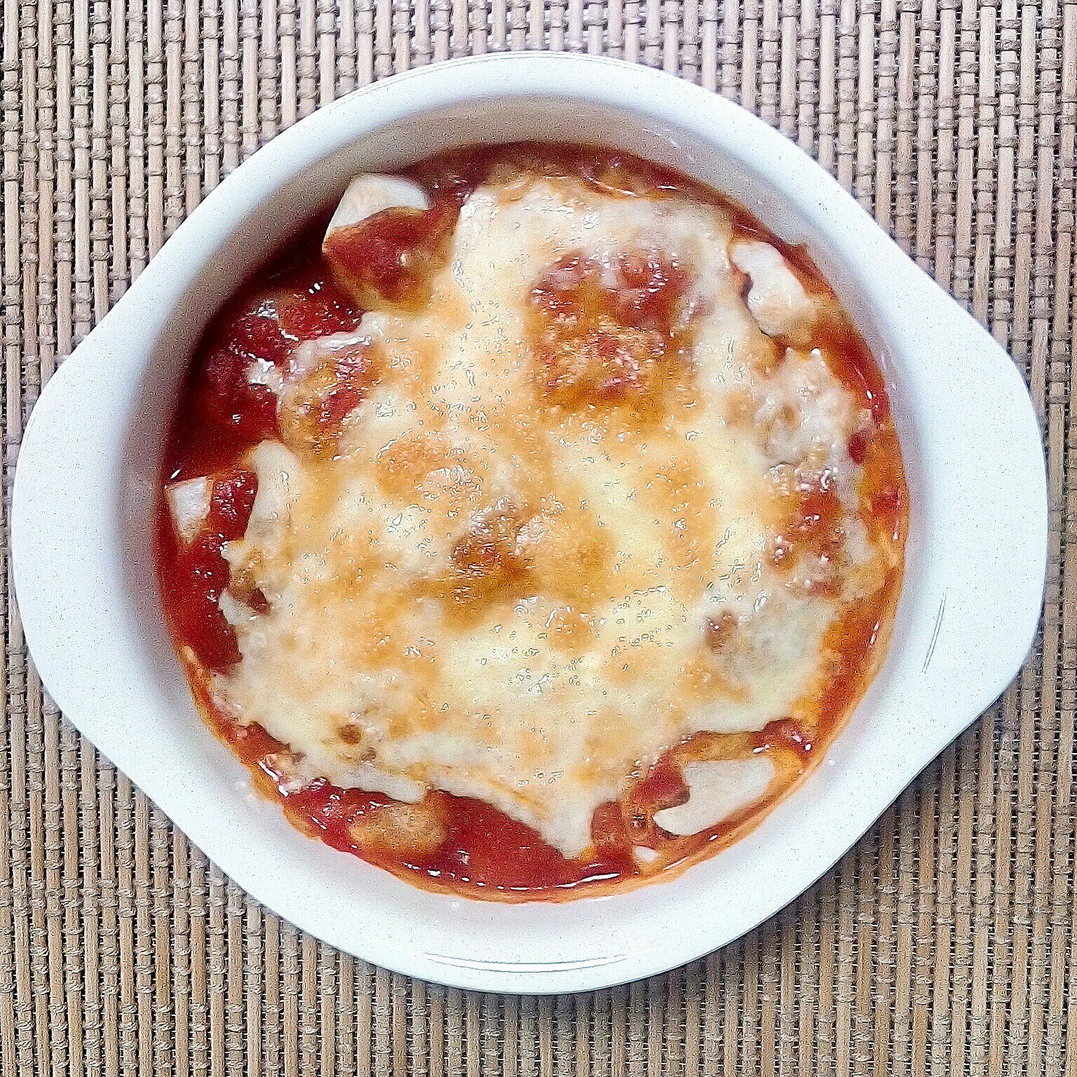 - トマトソースを1/2ずつ餅の上に流し入れてとろけるチーズをたっぷり乗せてオーブントースターで焦げ目がつくまで焼く。