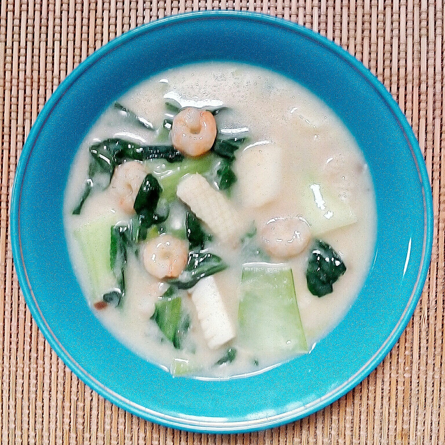 mituskoです。チンゲン菜が安かったので冷凍庫にあったエビ、イカと一緒にクリーム煮にしてみました。