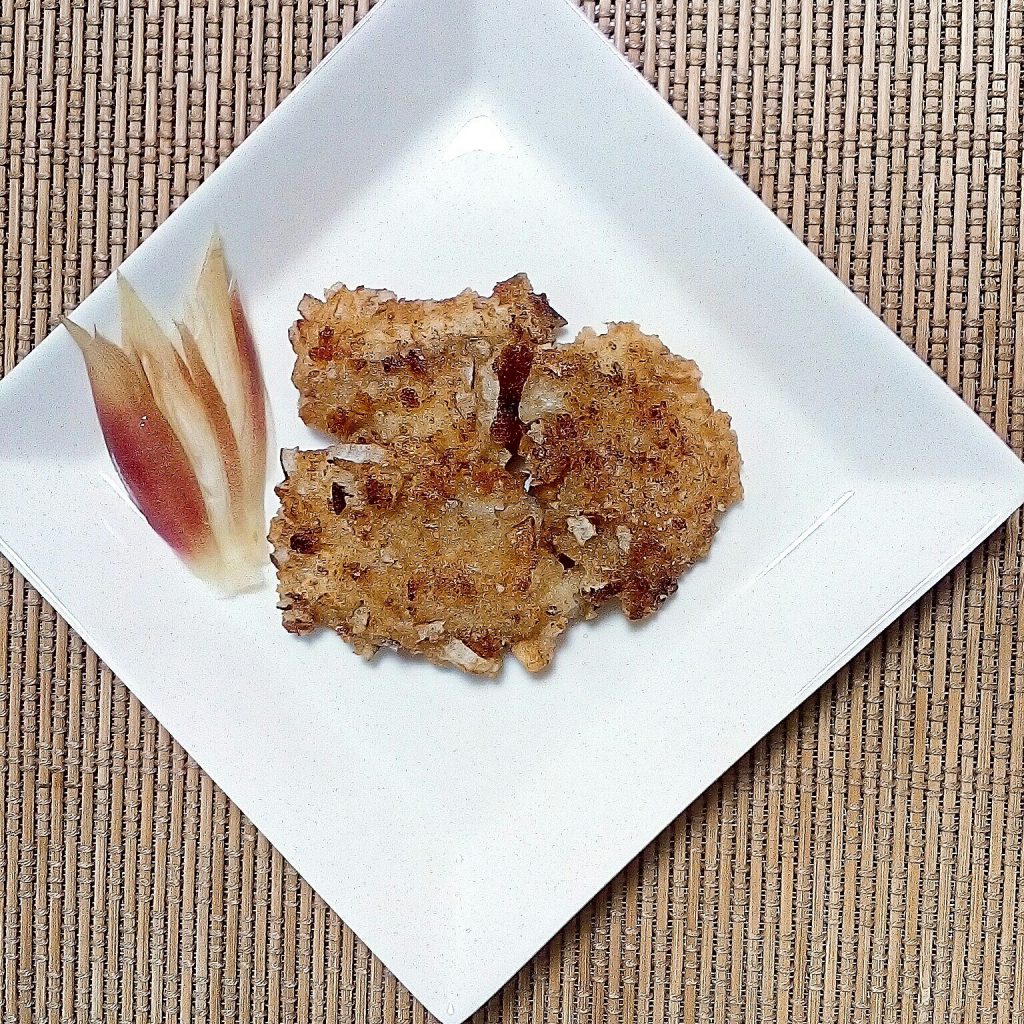 mitsukoです。骨なしタラの切り身があったので「せんべいカツ」をやってみました。おせんべいを粉々に砕いて衣にする、とっても香ばしいカツなんです😆