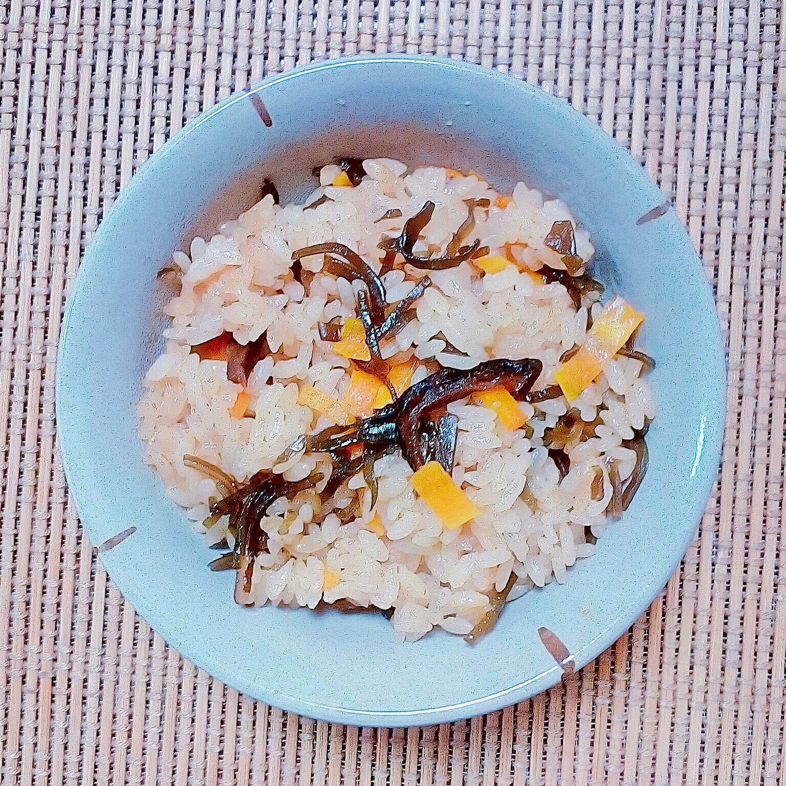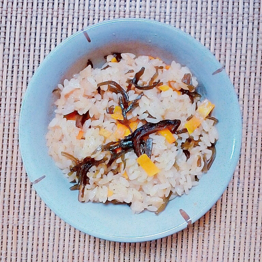 - 細切りした人参と椎茸昆布を入れて軽くかき混ぜる。
