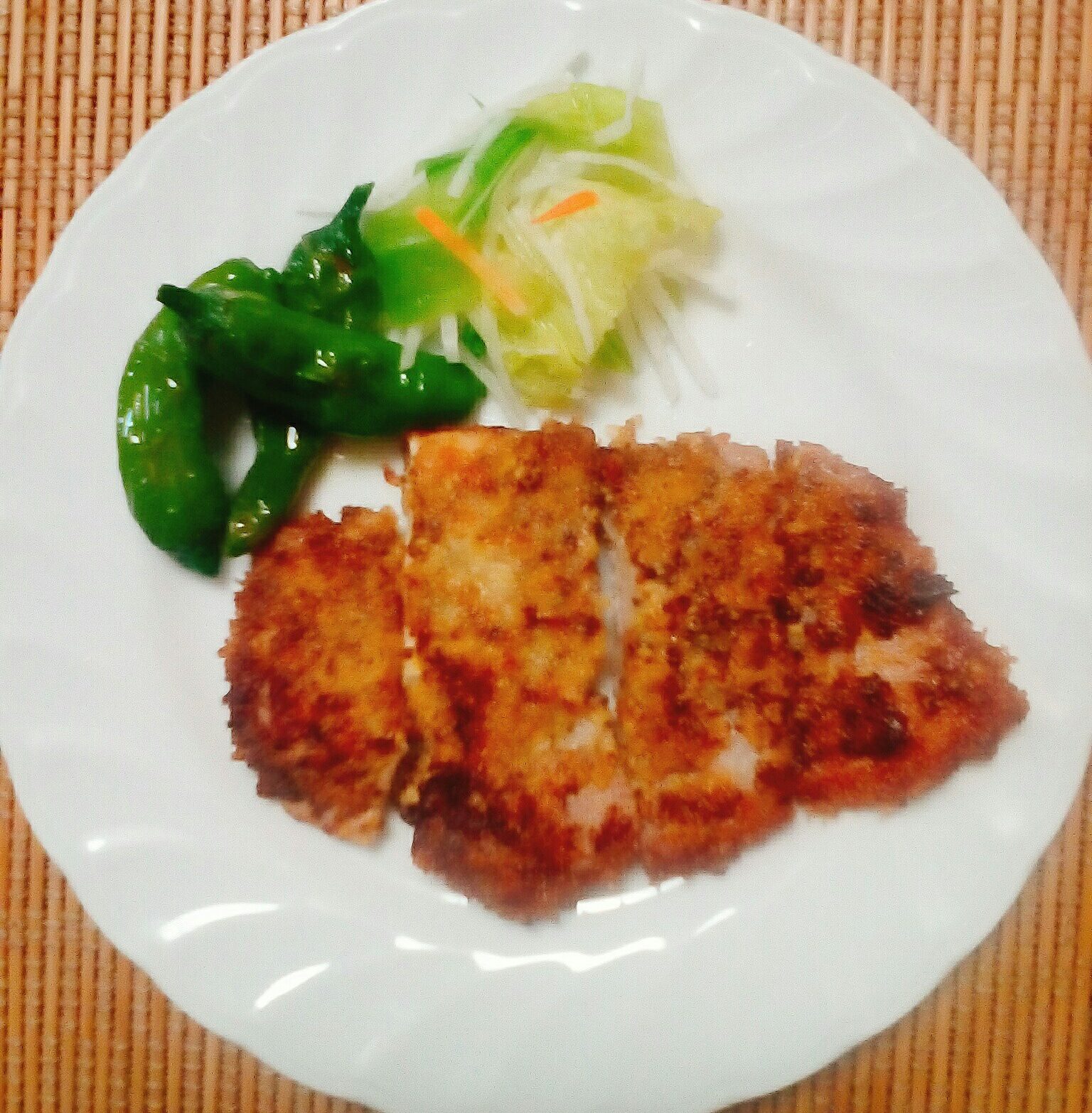 - フランスパンに2~3ミリのサラダ油を熱してパン粉を着けた豚肉を揚げ焼きにする。