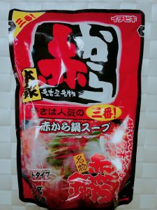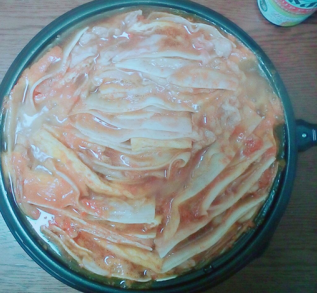 鍋にいっぱいミルフィーユを詰めて赤から鍋スープを入れてグツグツ煮ました。