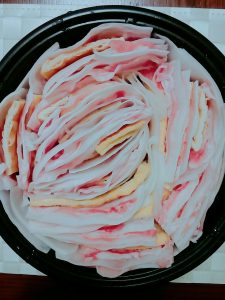 - まな板の上で大根、薄揚げ、豚バラを重ねていきます。