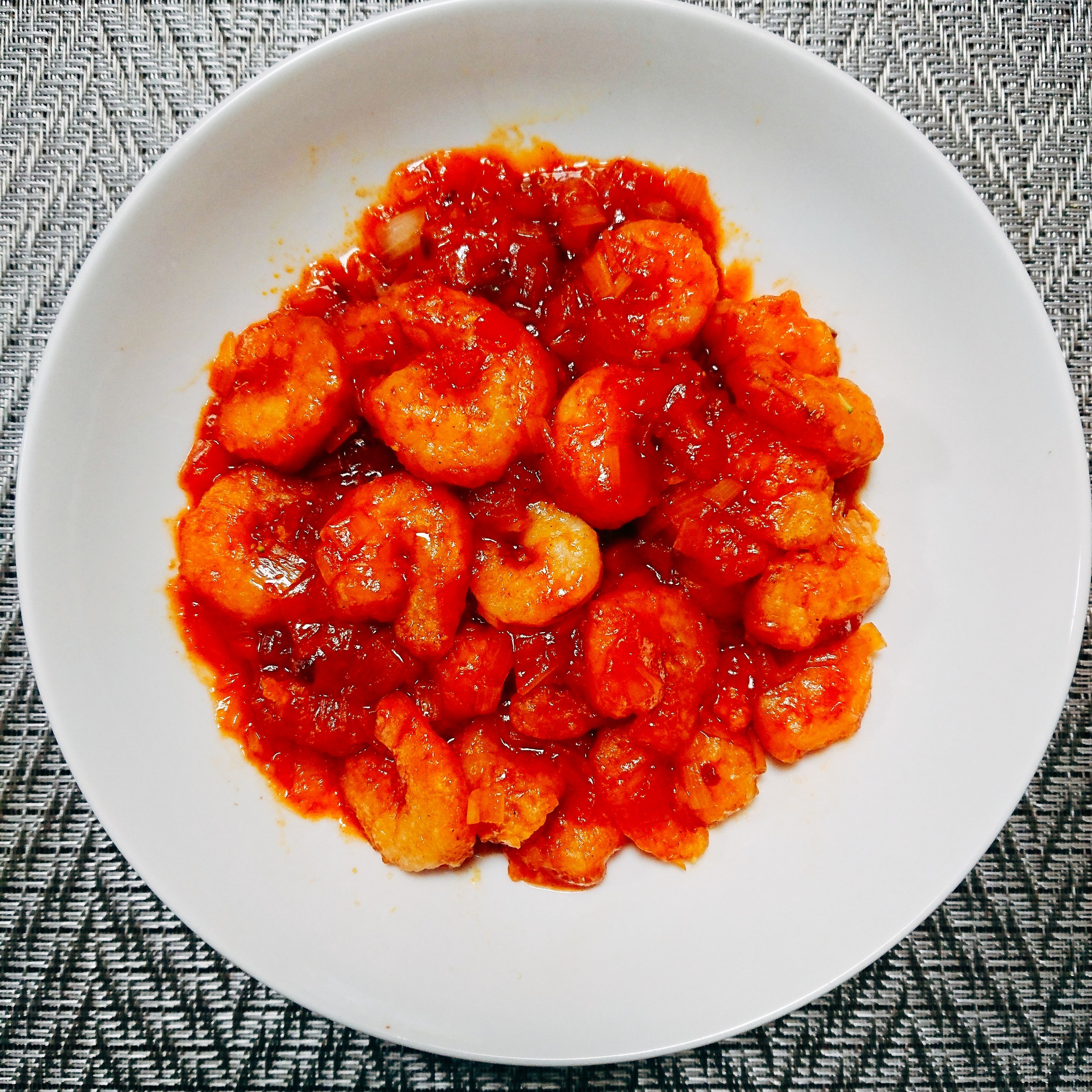 水80cc位を入れて創味シャンタン、ケチャッピー、豆板醤を入れて煮立ったら揚げ焼きにしたエビを入れて絡める。