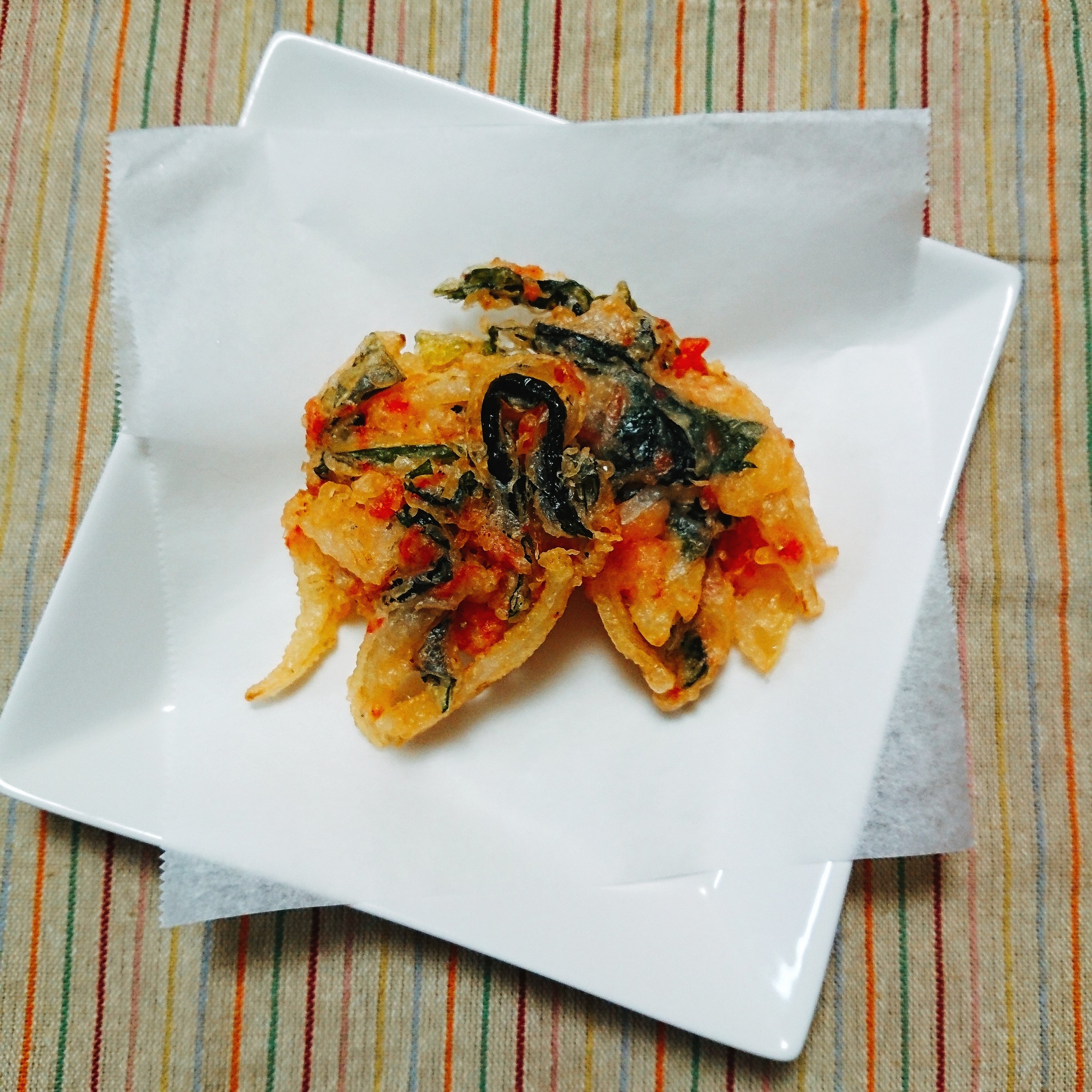 湯通ししたわかめの芯の部分と少し残しておいた葉の部分を使って天ぷらを揚げました。