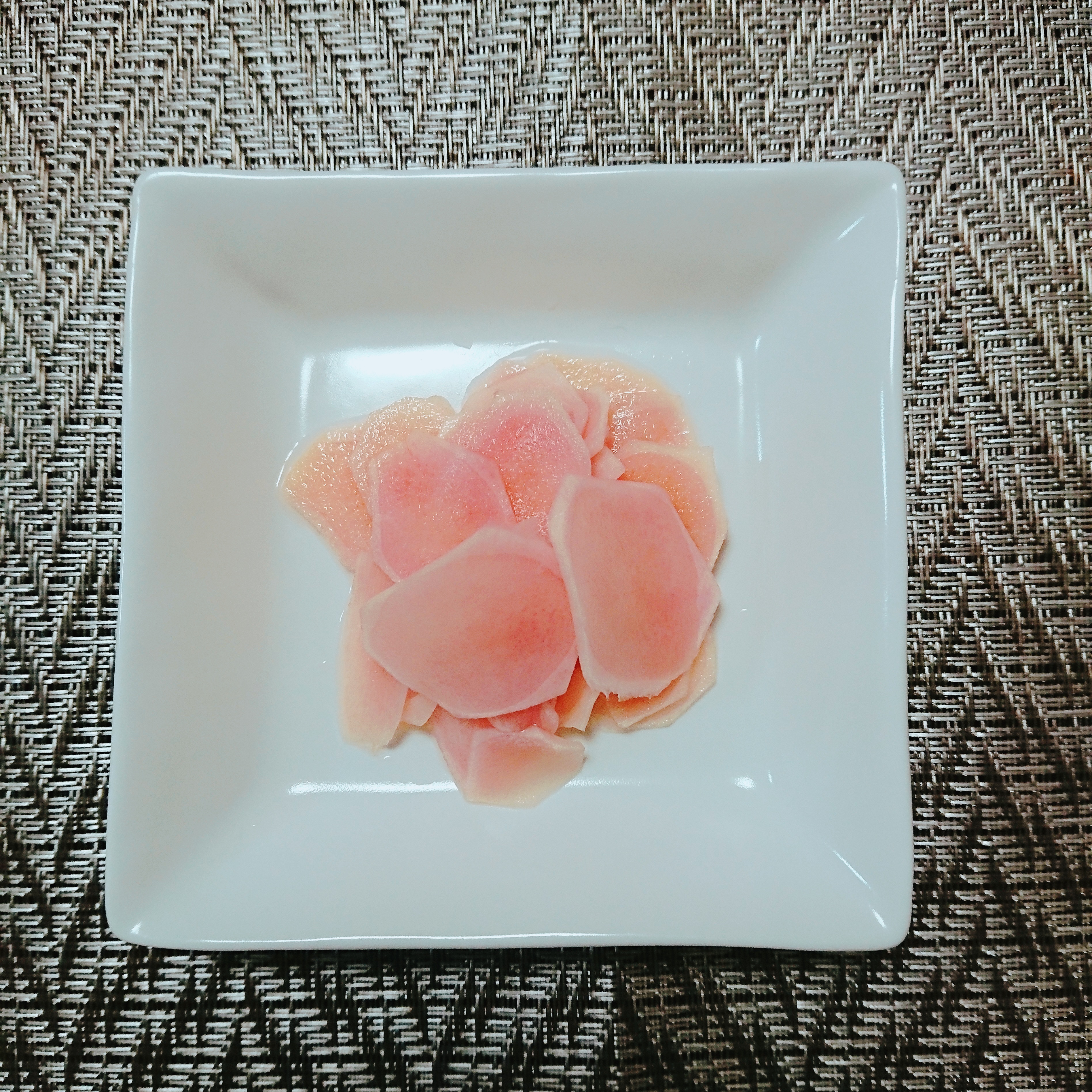 タッパーに薄く切った新生姜を入れてひたひたになるぐらいにすし酢を入れて蓋をして冷蔵庫に保存する。