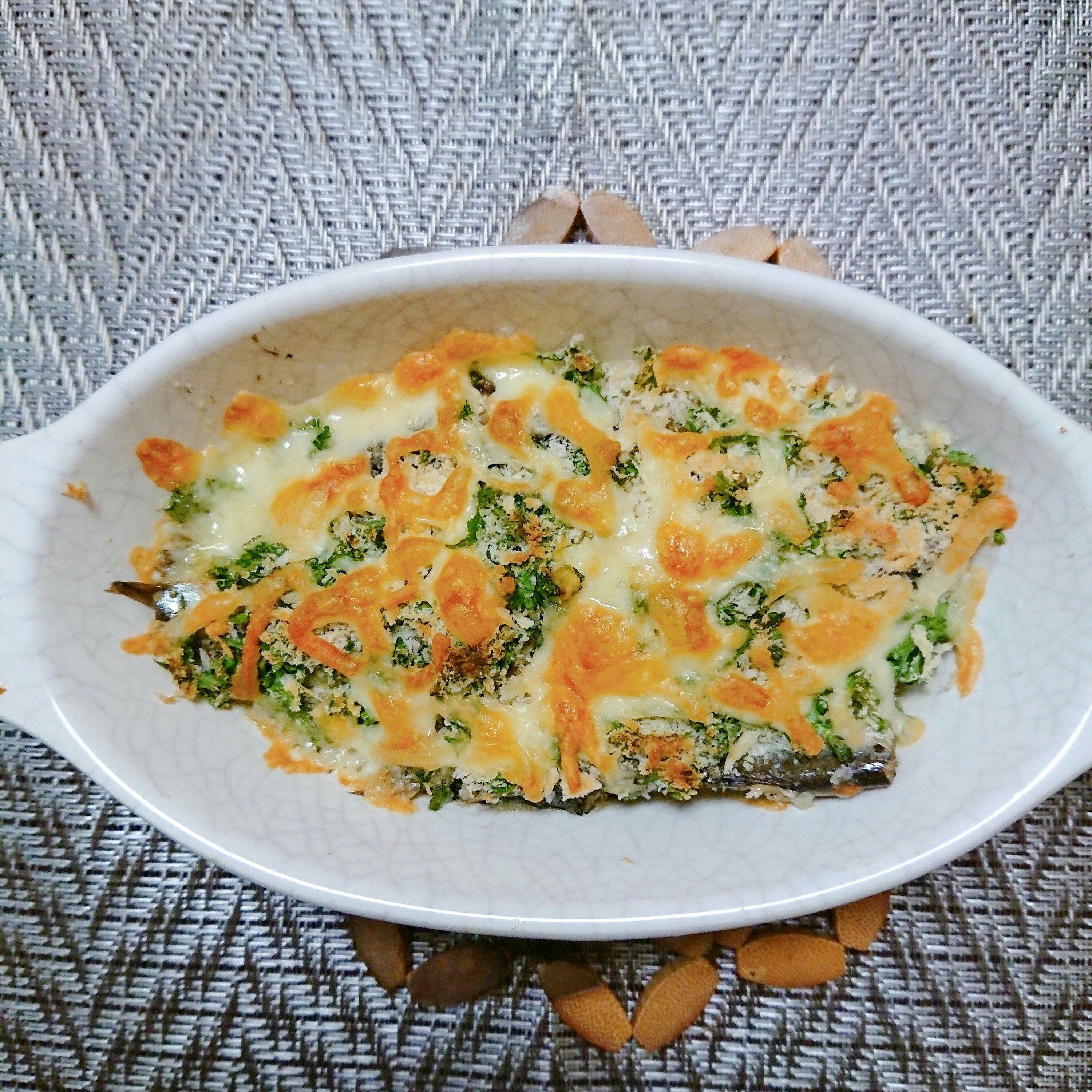 オイルサーデインの上に調味料を合わせたパン粉を乗せてオイルサーデインの油を回しかけてオーブントースターで焼き目がつく程度に焼く。