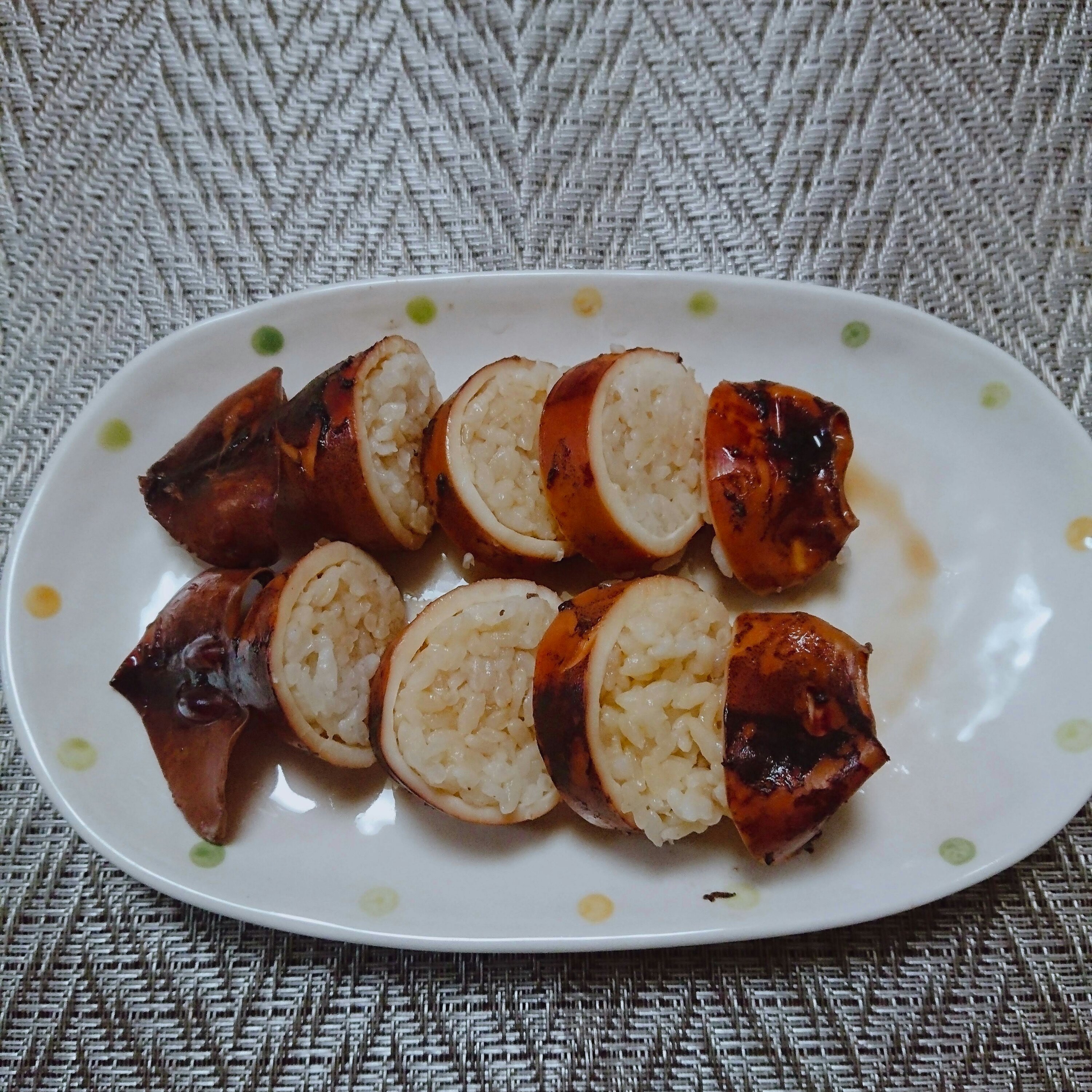するめいかの胴体の中に残りご飯を詰めます。