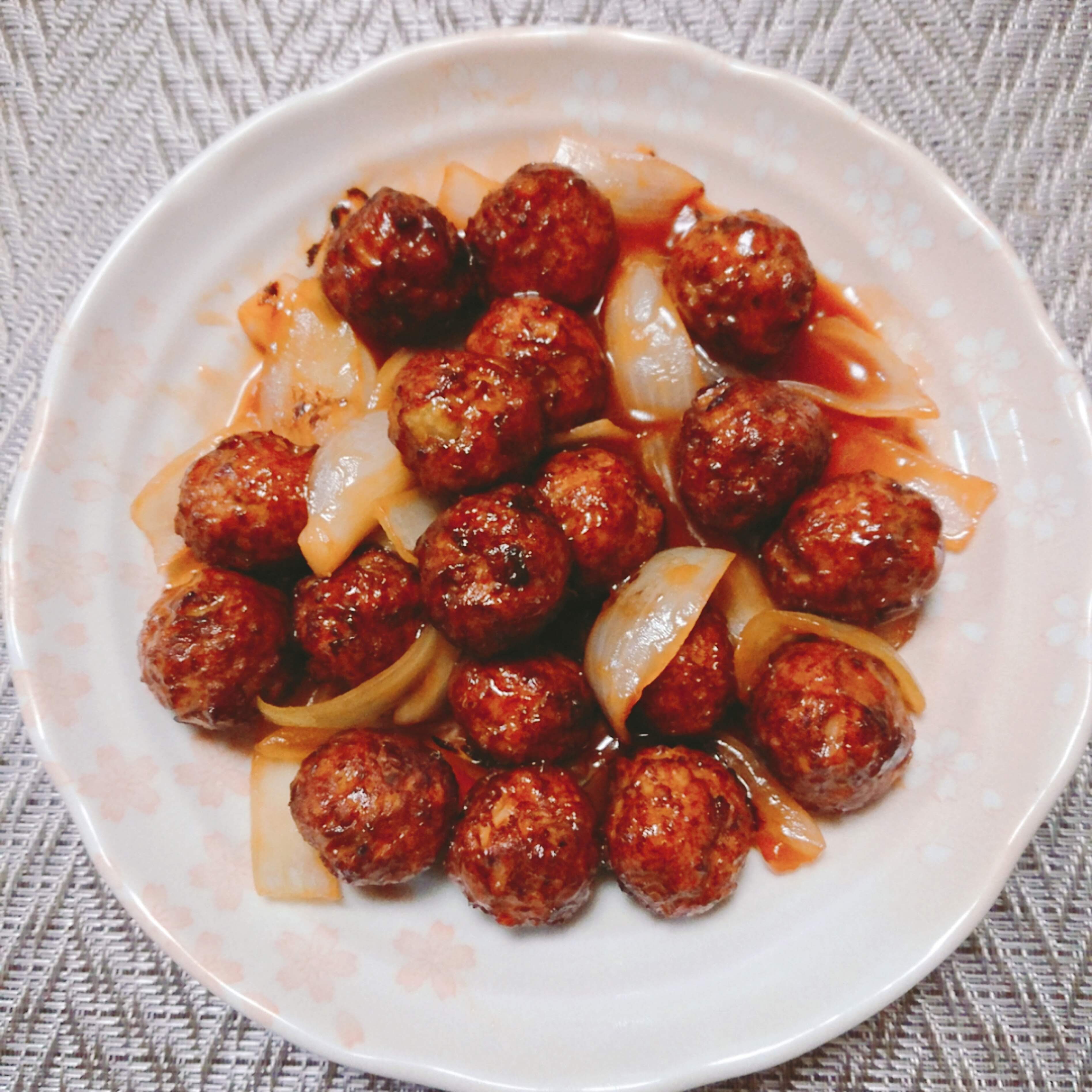 ある程度玉ねぎに火が通ったら調味料を入れて、水溶き片栗粉でとろみがついたら油で揚げた肉団子をからめたら出来上がりです。