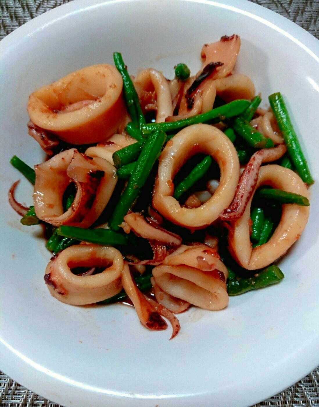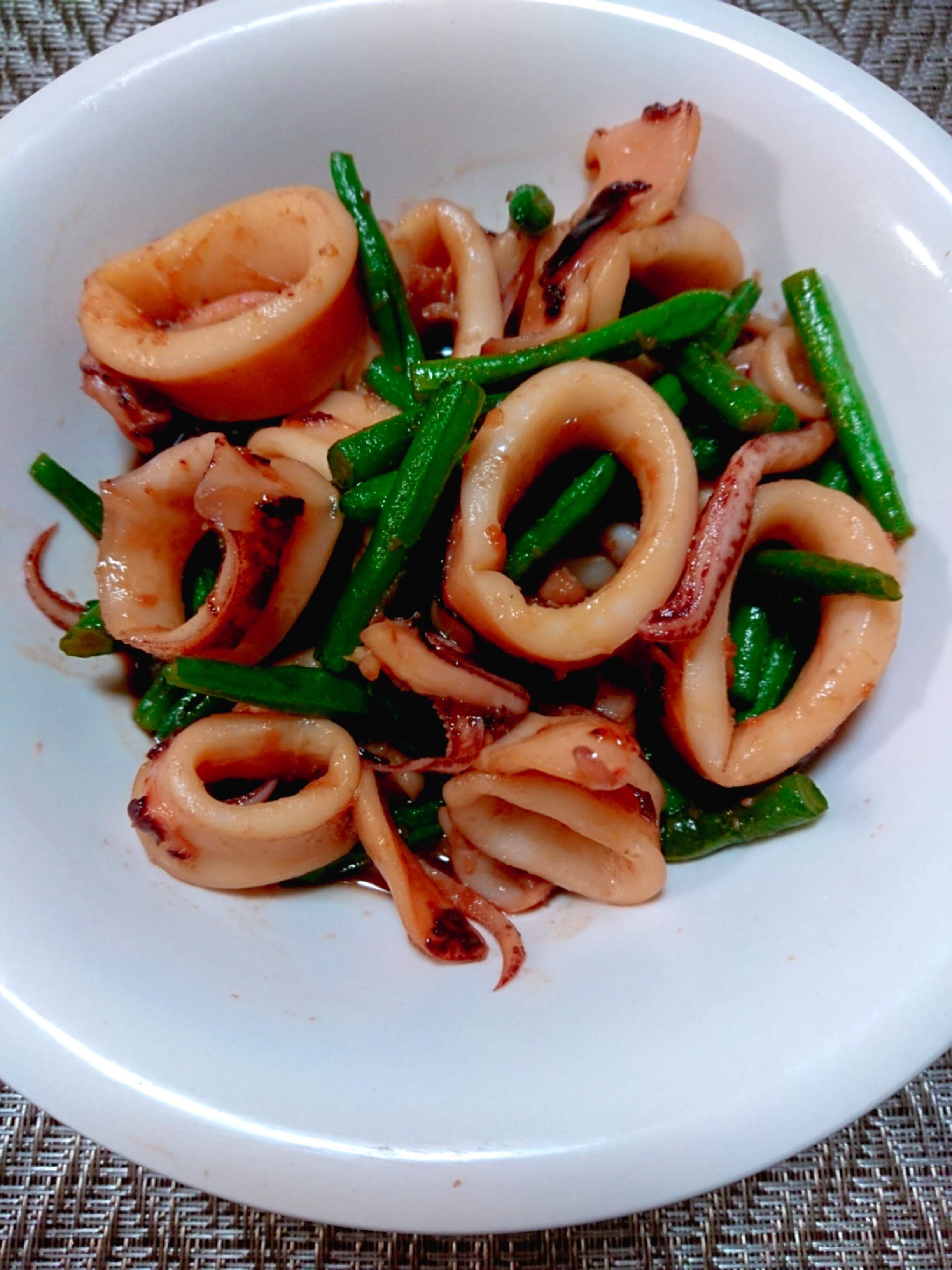 ジップロックにイカとインゲンを入れて、すき焼きのタレをしっかり浸かるぐらい入れて冷蔵庫で1~2時間寝かせる。