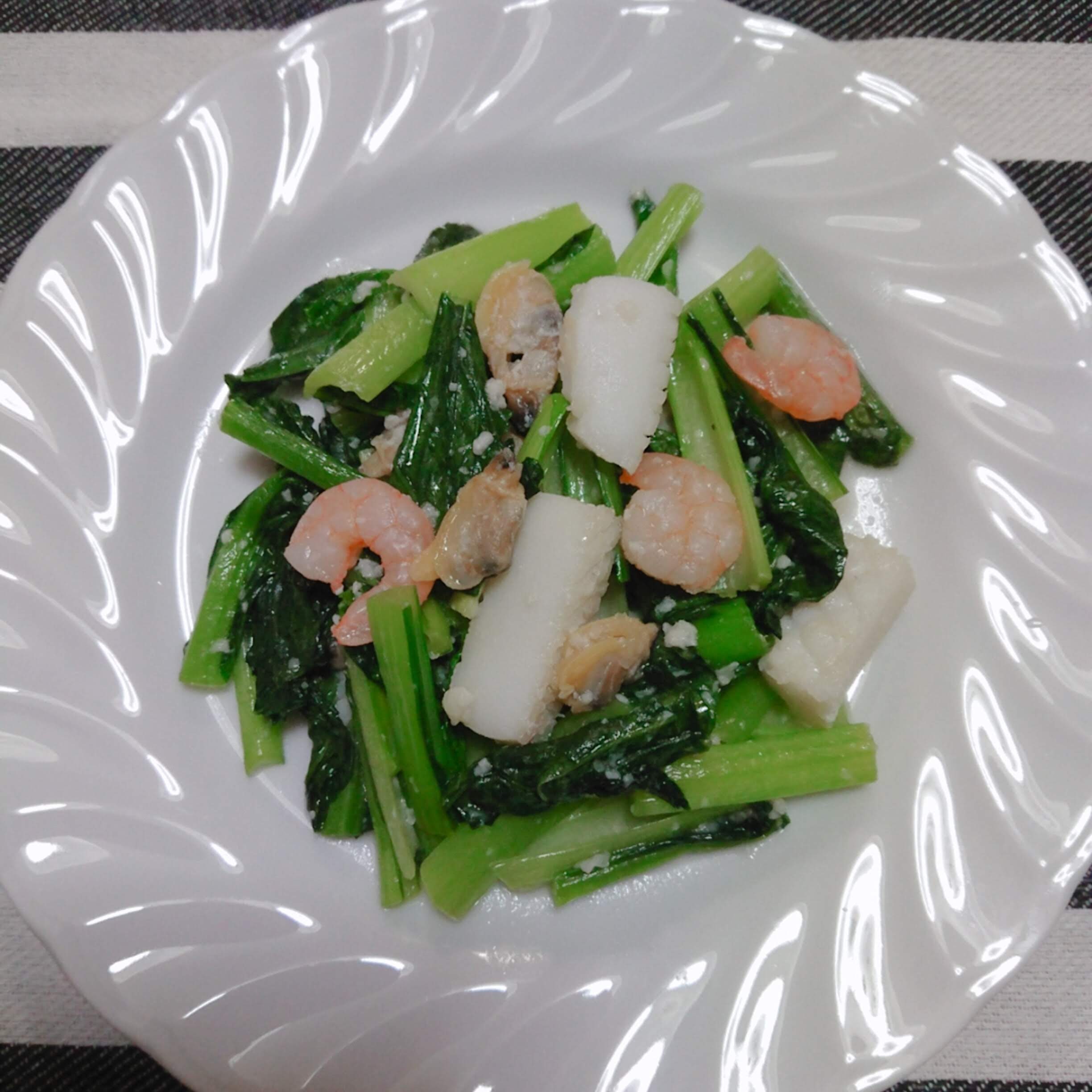 フライパンにサラダ油を熱して小松菜とシーフードを炒める。