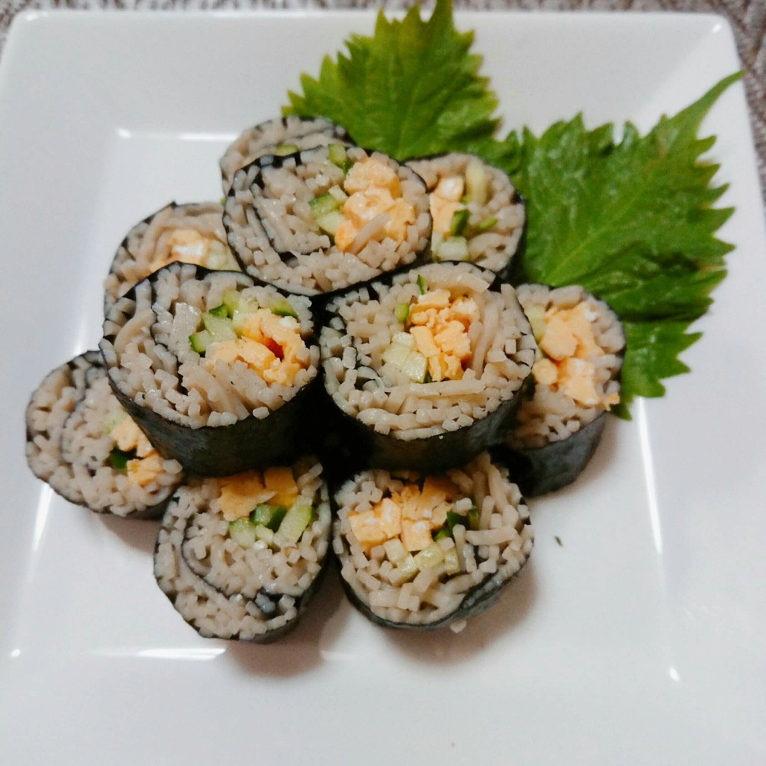 焼きのりを広げて水気を切った蕎麦を乗せて錦糸玉子、細切りにしたきゅうりを巻き寿司の要領で巻いていくだけです(笑)