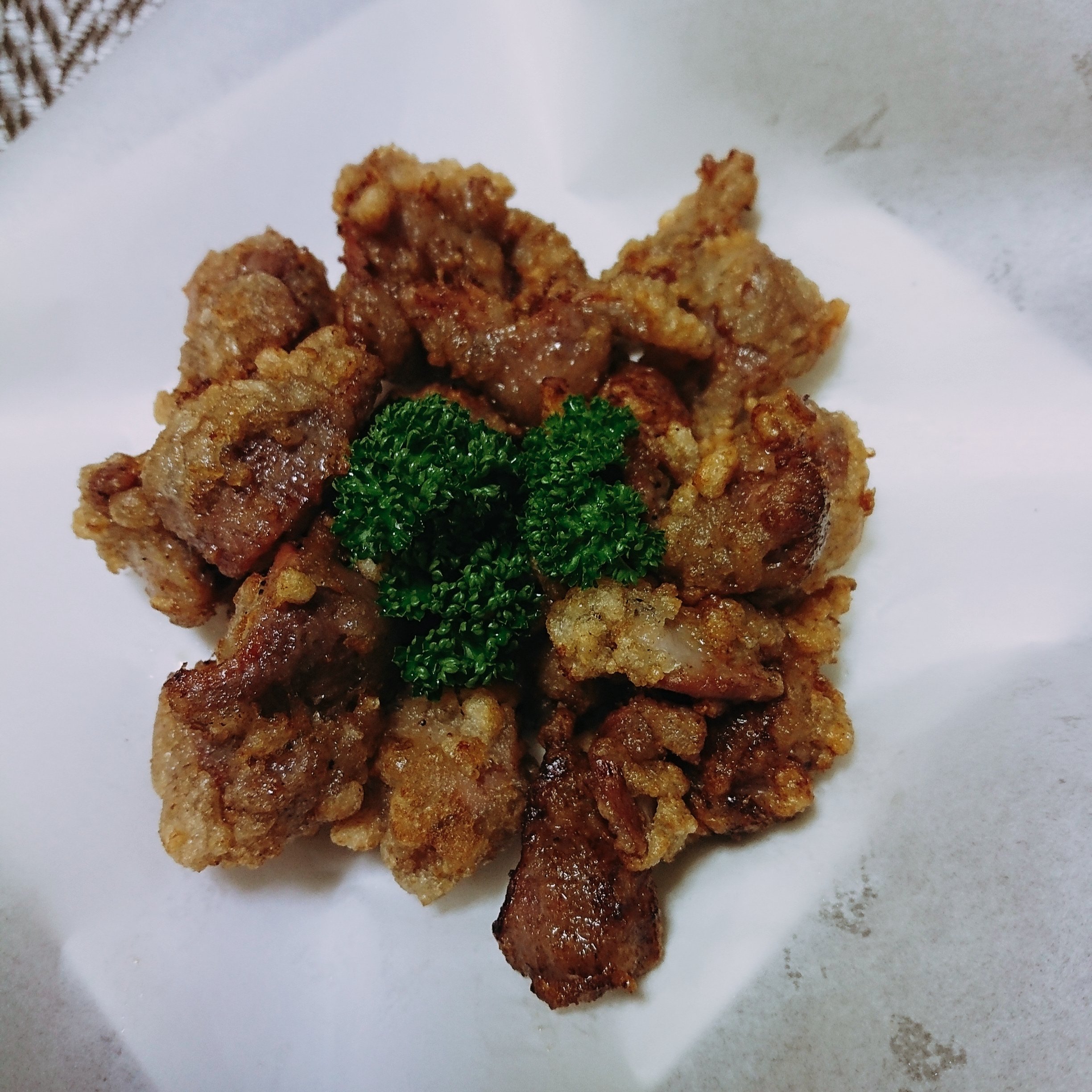 にんにくしょうが塩麹を絡めた砂ずりに片栗粉をまぶして油で揚げたら出来上がり。