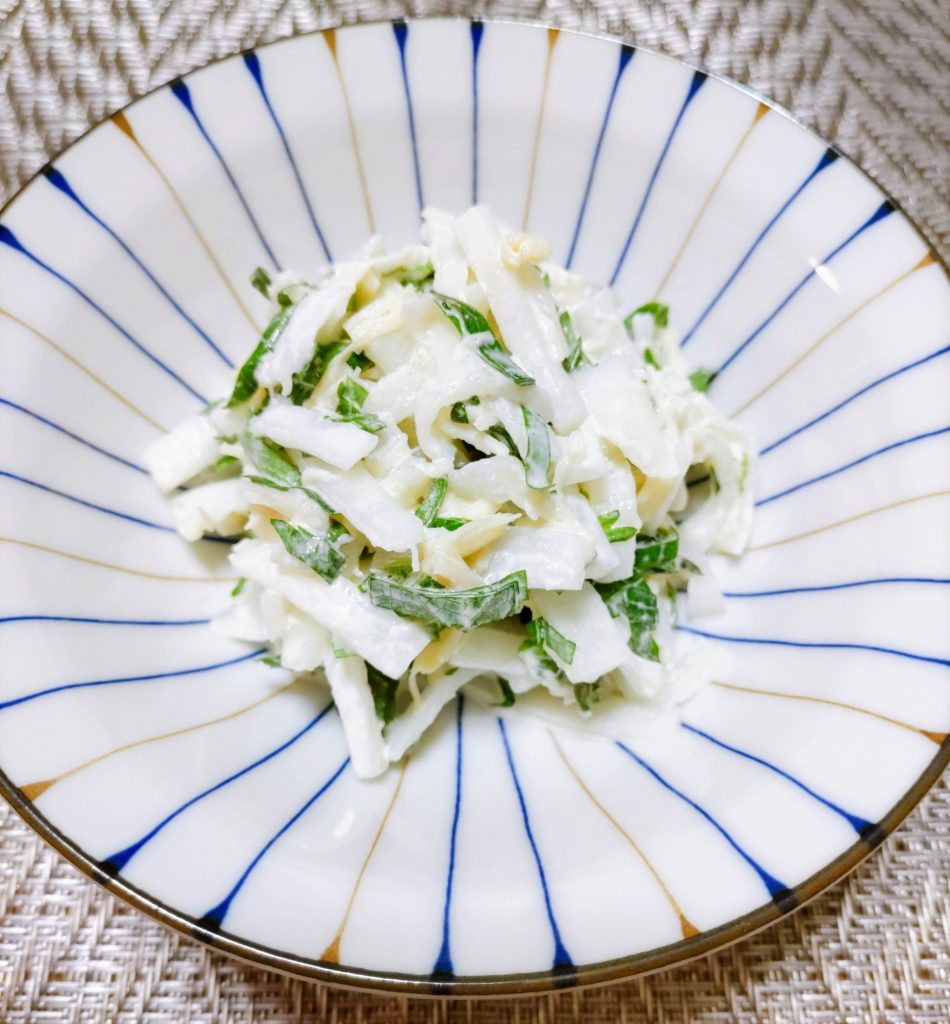 しっかり水気を切った大根と貝柱、細く切った大葉をマヨネーズで和えたら出来上がりです。