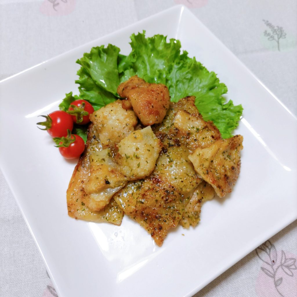 鶏皮にマジックソルトを振りかけて、薄く片栗粉をまぶしてフライパンでカリッと焼くだけです。